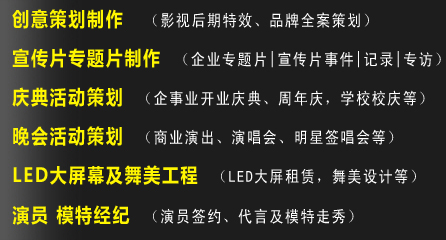團隊 Team多年的行業(yè)淬練、豐富的制作經(jīng)驗使我們建立起一支專業(yè)、高效、富有創(chuàng)造力的團隊——國家級的導演,為全片制作指點乾坤;睿智的策劃撰稿,妙筆點亮全片靈魂;成熟的執(zhí)行導演,拍攝中統(tǒng)籌畫面效果;老到的攝影師,嫻熟地記錄各式場景;還有新銳的后期編導,用靈感為作品增色;充滿熱情的剪輯師、動畫包裝師,讓畫面效果更為精彩繽紛;才華橫溢的音樂制作人,帶來渲染氣勢的合片旋律……不同的工種通力合作,眾志成城,為一個完美影視作品的誕生齊心協(xié)力。